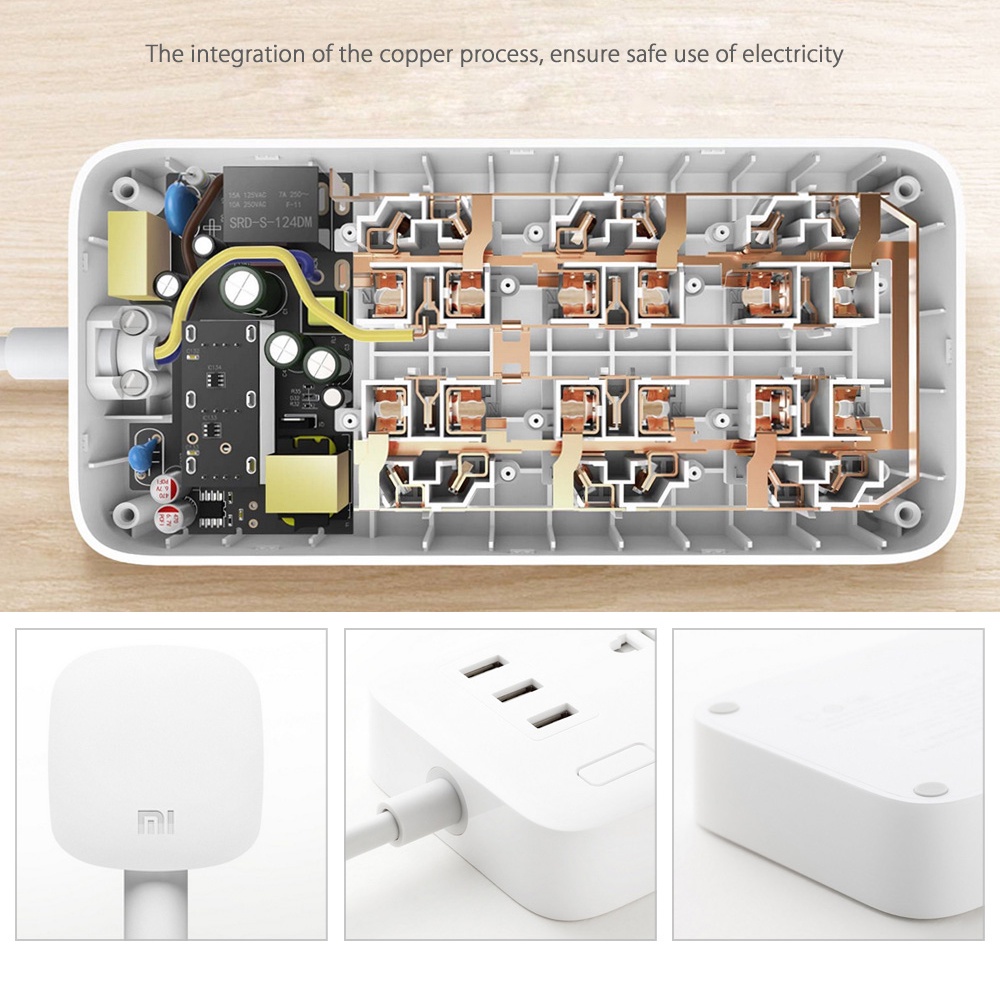 -Bên trong của ổ cắm điện Xiaomi Mi Power Strip 6 đầu và 3 cổng USB là hệ thống dẫn điện được làm từ đồng nguyên chất cho khả năng truyền điện cũng như tối ưu hóa hiệu suất được tốt nhất. Thiết bị hỗ trợ 6 đầu điện hỗ trợ nguồn điện cho phép 100 – 240V (thích hợp sử dụng ở Việt Nam). Ngoài ra, Xiaomi còn trang bị thêm cho sản phẩm của mình hệ thống tự động ngắt điện ngay lập tức khi phát hiện điện áp cao đột ngột.