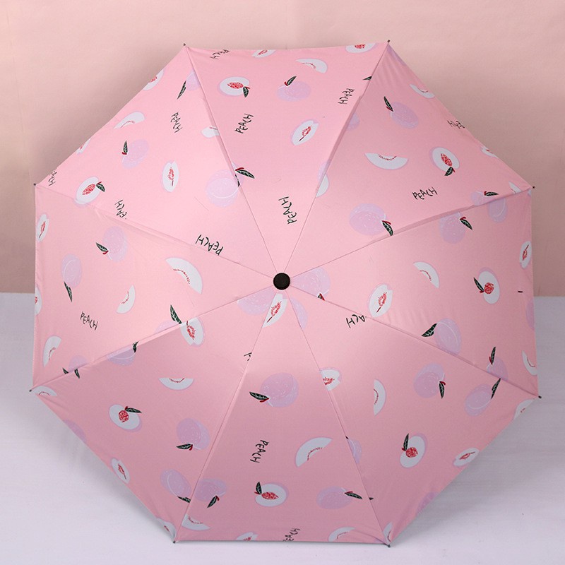 - Ô dù gấp gọn hình hoa quả có 3 lớp, với lớp ngoài thiết kế thanh lịch điểm hoa quả độc đáo, còn lớp trong là màu đen tuyền vô cùng mạnh mẽ. Với thiết kế 3 lớp từ vải cao cấp giúp tăng cường khả năng chống nắng lên đến 99%, giúp bảo vệ làn da của bạn cực tốt.