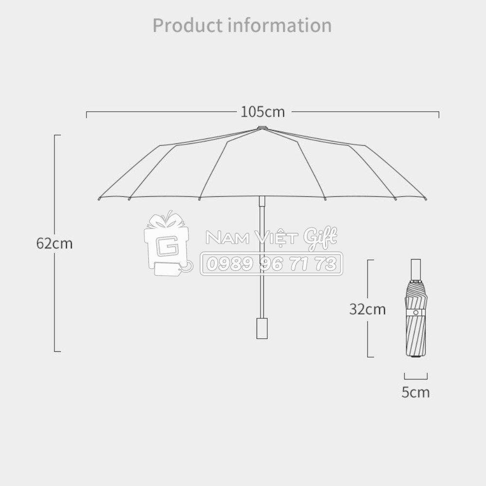 Kích thước khi mở: đường kính dù 102cm, cao 62cm