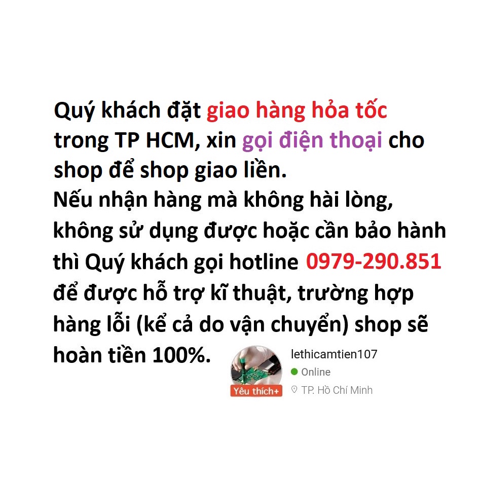 Nếu nhận hàng mà không hài lòng, không sử dụng được hoặc cần bảo hành thì Quý khách gọi hotline 0979-290.851 để được hỗ trợ kĩ thuật, trường hợp hàng lỗi (kể cả do vận chuyển) shop sẽ hoàn tiền 100%.Đ/c: Chung cư Nhất Lan 3, Đường 3A, phường Tân Tạo A, Bình Tân, tp.HCM