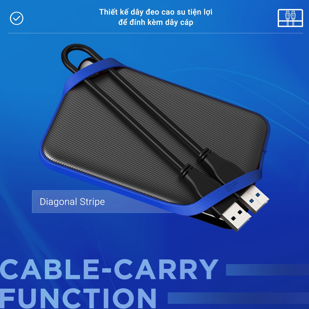 Silicon Power A62 GAME DRIVE được thiết kế dây silicone đính kém thuận tiện cho việc đeo dây cáp kèm theo ổ cứng. Ngoài ra với bề mặt được thiết kế để hạn chế dấu vân tay bụi bẩn.