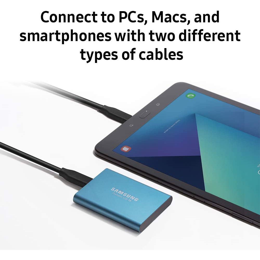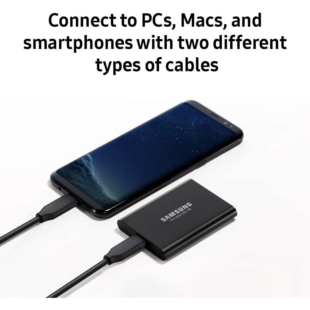 T5 giao tiếp với các thiết bị khác qua cổng USB Type-C to Type-C hoặc USB Type-C to USB A. Mọi thiết bị như laptop, máy tính bảng hiện nay đều có thể sử dụng với chiếc Samsung T5 một cách dễ dàng