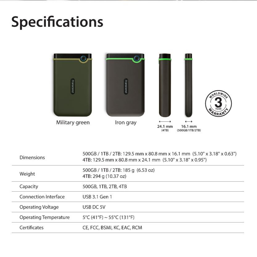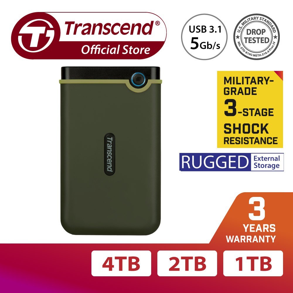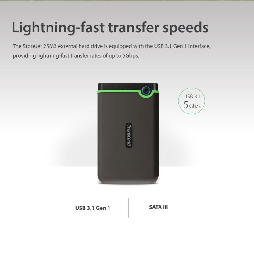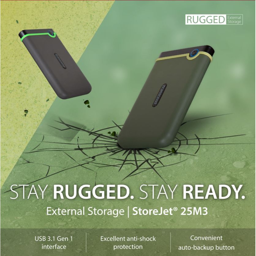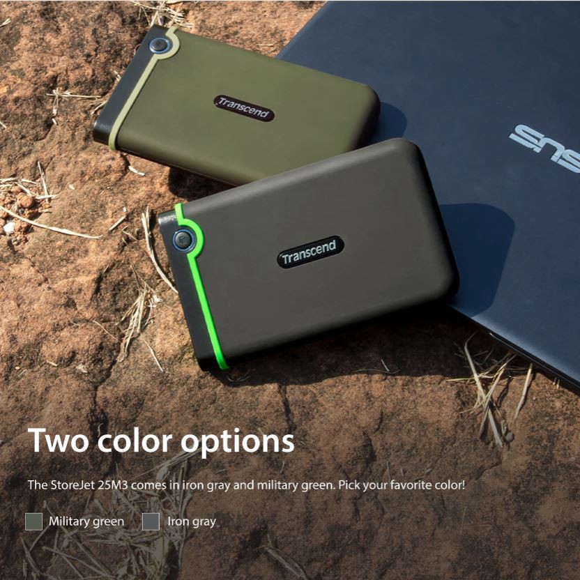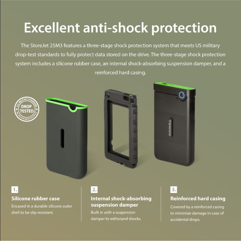 Hệ thống bảo vệ ba lớp đạt chuẩn chống sốc của quân đội Hoa KỳTranscend StoreJet 25M3 sản xuất theo tiêu chuẩn MIL-STD-810F – Transit Drop mang đến sự bảo vệ chắc chắn cho dữ liệu.