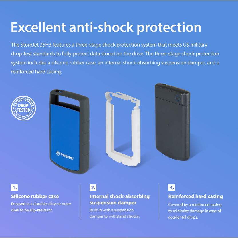 Ổ cứng di động Transcend 25H3P 2TB thiết kế 3 lớp chống sốc theo tiêu chuẩn quân đội của Mỹ. Vỏ ngoài silicon với khả năng chống va đập, chống thấm nước và chống cháy.