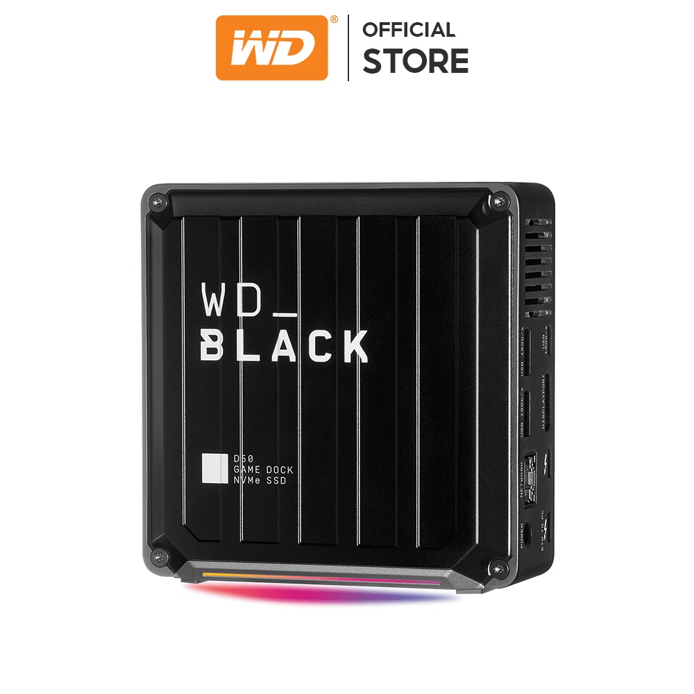 Ổ cứng gắn ngoài WD Black D50 Game Dock SSD chính hãng là một chiếc ổ SSD khá độc đáo của thương hiệu WD. Sản phẩm được sản xuất dành cho nhóm người dùng game thủ và những người dùng có nhu cầu trao đổi dữ liệu lớn.Qua kết nối Thunderbolt 3, chiếc dock này hỗ trợ trình xuất tối đa 5K 60Hz qua DisplayPort, nó có 2 cổng USB-C (USB 3.2 Gen2 10 Gbps), 3 cổng USB-A (USB 3.2 Gen2 10 Gbps), jack âm thanh, LAN. Chiếc dock này hỗ trợ sạc 87 W. Bên trong chiếc dock này là ổ SSD với dung lượng 1 TB hoặc 2 TB, tốc độ đọc tuần tự 3000 MB/s, ghi tuần tự 2500 MB/s.