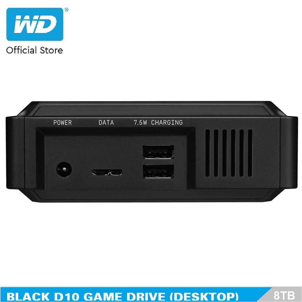 Ổ WD_Black D10 được trang bị 2 cổng sạc USB Type-A 7.5W để bạn sạc thiết bị hay phụ kiện game dễ dàng hơn.