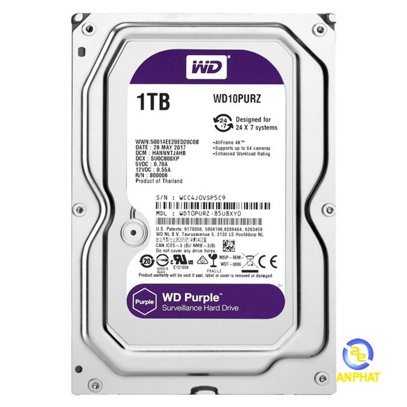 Thông tin sản phẩm.. Ổ cứng HDD WD Purple 3.5\" 1TB 5400RPM SATA 3 64MB Cache..Dung lượng lưu trữ lớn.