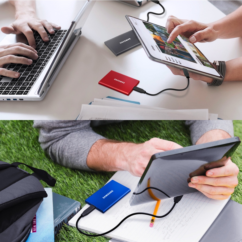✪ Ổ cứng di động SSD Samsung Portable T7 truy cập tập tin của bạn mọi lúc, mọi nơi. T7 tương thích với PC, Mac, thiết bị Android, máy chơi game, v.v. Bao gồm trong hộp là cáp USB loại C-to-C và loại C-to-A để thêm phần thuận tiện.