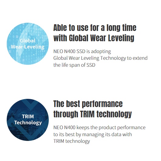 Ổ Cứng SSD KLEVV NEO N400 được ứng dụng nhiều công nghệ khác nhau để cải thiện tối đa tuổi thọ. Ví dụ như: