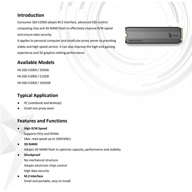 Giới thiệu Ổ cứng SSD M.2 NVMe (PCIe) HIKVISION HSSSDE2000(STD) Hàng Chính Hãng
