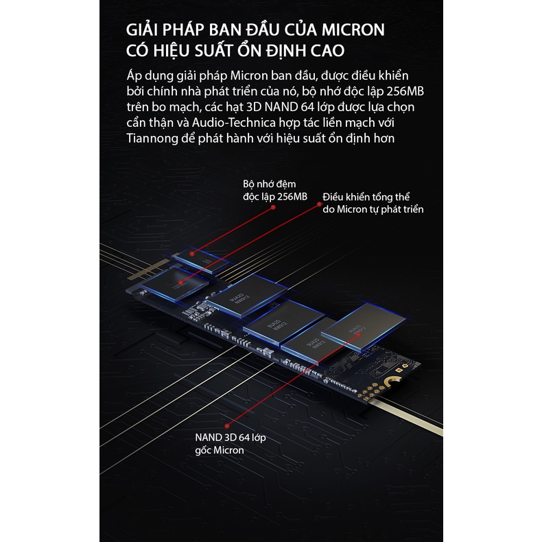 - Bộ nhớ đệm đọc lập 256MB - NVME 1.3 - PCle 3.0 với 4 kênh sử dụng chế độ chơi game chính do Micron tự phát triển, có thể đọc liên tục 2800MB/s giúp bạn tận hưởng trải nghiệm thú vị.