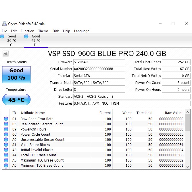 TestLab tiến hành kiểm tra nhiệt độ và tình trạng SSD với ứng dụng CrytalDisklnfo phiên bản 8.4.2 x64. Tình trạng SSD được thông báo tốt - nhiệt độ là 45độ C nằm trong phạm vi của nhà sản xuất công bố o độ C và ngưỡng an toàn 70 độ C, transfer mode hiển thị giao tiếp SATA 600 tức SATA 6 Gbps