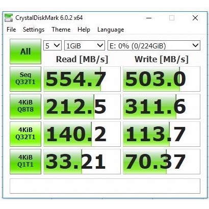 - Tốc độ đọc tuần tự (tối đa): 480 - 520 MB/s