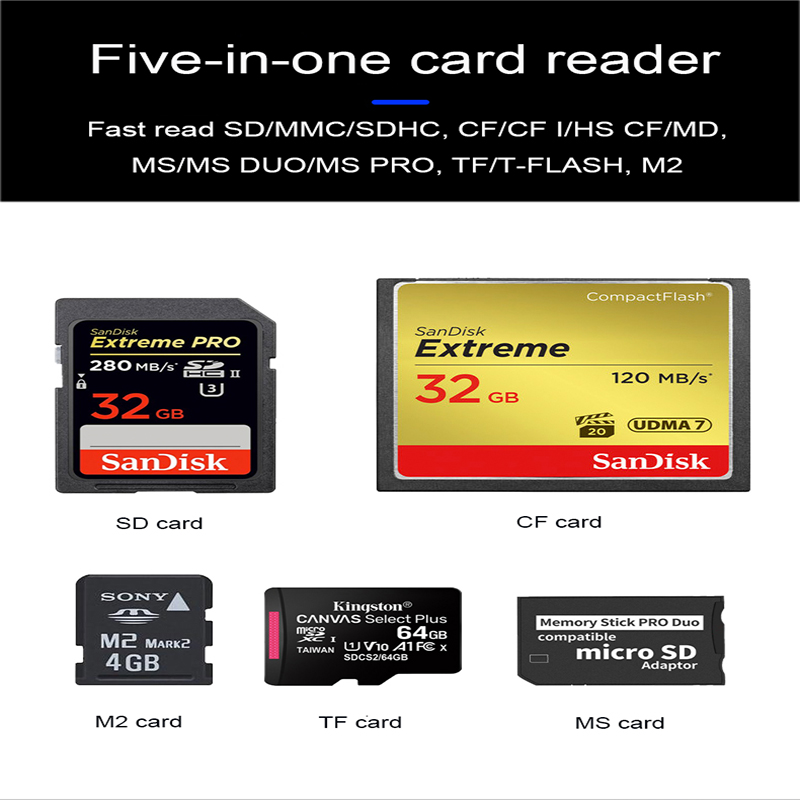 7. Đầu đọc thẻ năm trong một, đọc nhanh SD / MMC / SDHC, CF / CF I / HS CF / MD, MS / MS Duo / MS Pro, TF / T-Flash, M2.