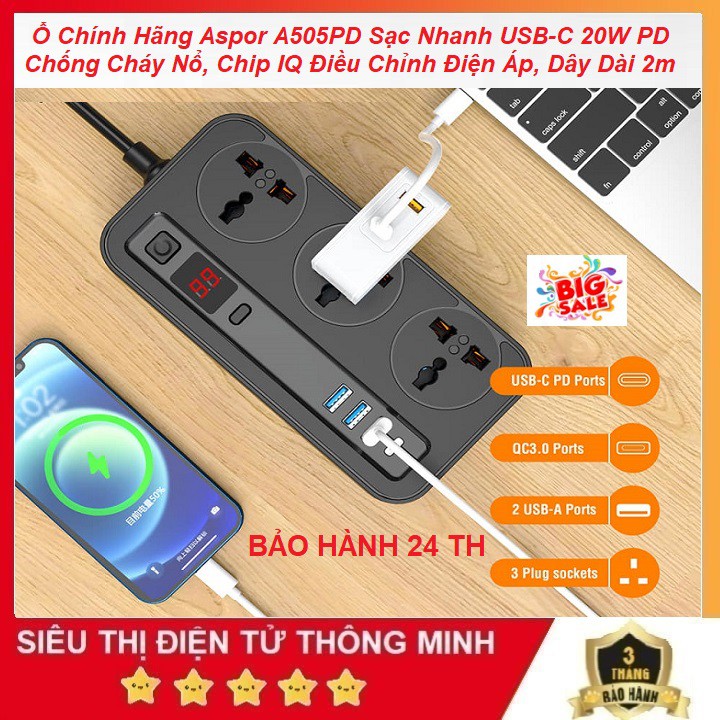 Giới thiệu Ổ Điện Chính Hãng Aspor A505-PD, Sạc Nhanh USB C-PD 20W - Có Hẹn Giờ - Chống Cháy Nổ - Dây Dài 2m