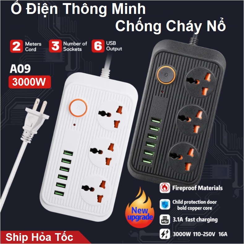Điện Chống Giật A09 Đa Năng Thông Minh, 3 Ổ Cắm Tích Hợp 6 Cổng USB Sạc Nhanh 3.1A - Chống Cháy Nổ - Bảo Hành 10 Năm----------------------------------------