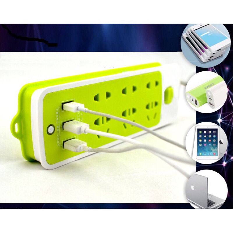 Ổ điện đa năng 3 cổng USB + 6 Ổ cắm, Ổ điện màu xanh lá nhỏ gọn tiện lợi