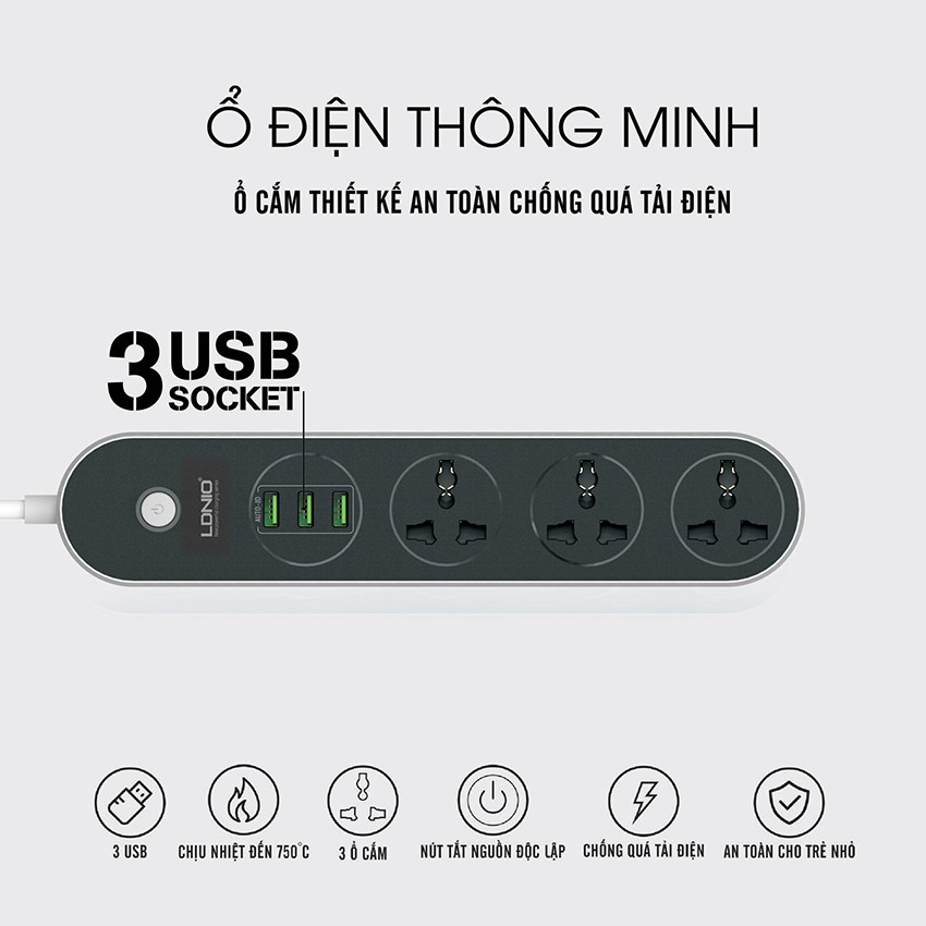 Ổ điện đa năng 3 cổng USB sạc nhanh Q 3.0 - Ổ điện cho điện thoại máy tính, laptop - LDNIO - Chính Hãng