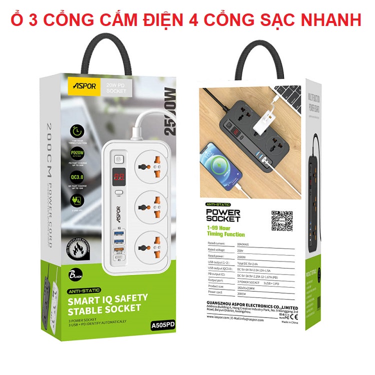 Thiết Bị Điện Gia Dụng > Mạch điện & Phụ tùng > Ổ cắm điện & Dây nối || Ổ Điện Đa Năng Aspor A505-PD, Sạc Nhanh USB C-PD 20W, Chống Cháy Nổ -Chip IQ Điều Chỉnh Điện Áp, Dây Dài 2m - Có Hẹn GiờCòn hàng