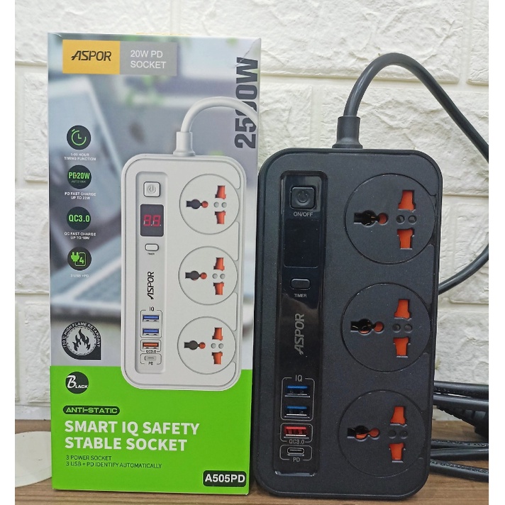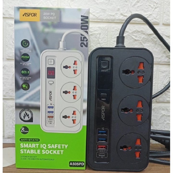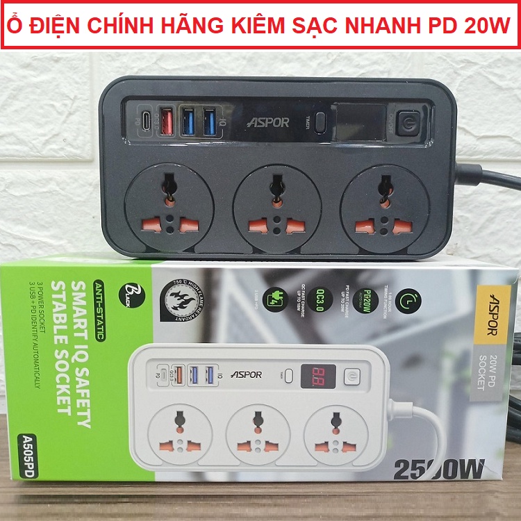 Ổ Điện Đa Năng Thông Minh Aspor A505PD Sạc Nhanh USB-C 20W PD, Chống Cháy Nổ, Chip IQ điều Chỉnh Điện Áp, Dây Dài 2m, Có Hẹn Giờ Bảo Hành 24 Tháng.USB Power Delivery (PD): USB PD hiện nay chúng ta sử dụng là chuẩn PD 3.0. USB Power Delivery được thiết kế với 5 cấu hình sạc, trải dài từ 2.5W lên tới 100W. Nhờ vậy, đáp ứng được nhiều mức sạc, đa dạng nhiều thiết bị, như điện thoại, máy tính bảng, laptop, máy tính bàn,… Để sử dụng USB PD thì chúng ta cần phải dùng cổng USB -C.
