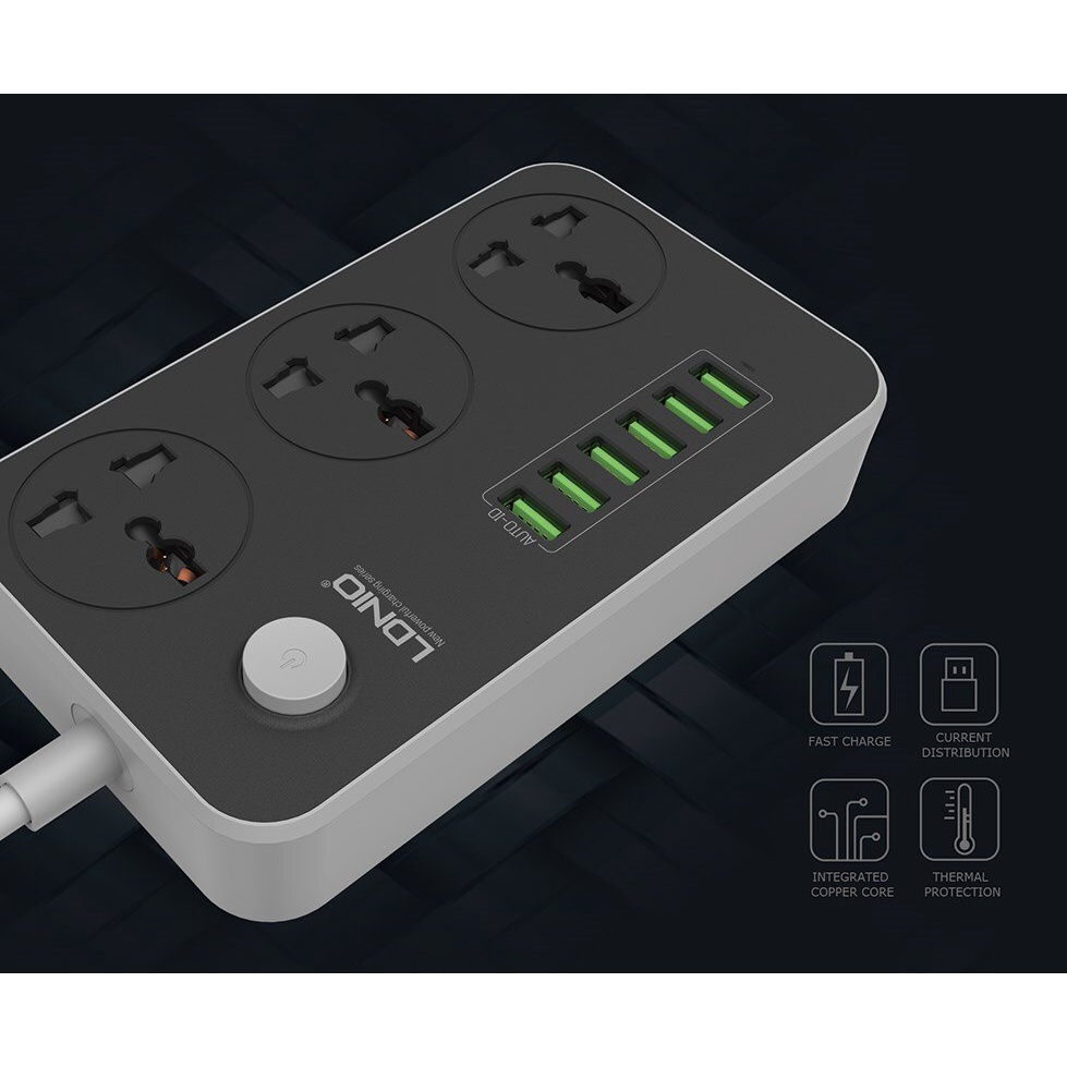 Ổ gồm 3 cổng AC 220V, 6 cổng USB sạc nhanh (max 3.4A), có chip IC thông minh tự ngắt khi quá tải hoặc dòng điện vào lên quá 250V, bảo đảm an toàn cho người sử dụng