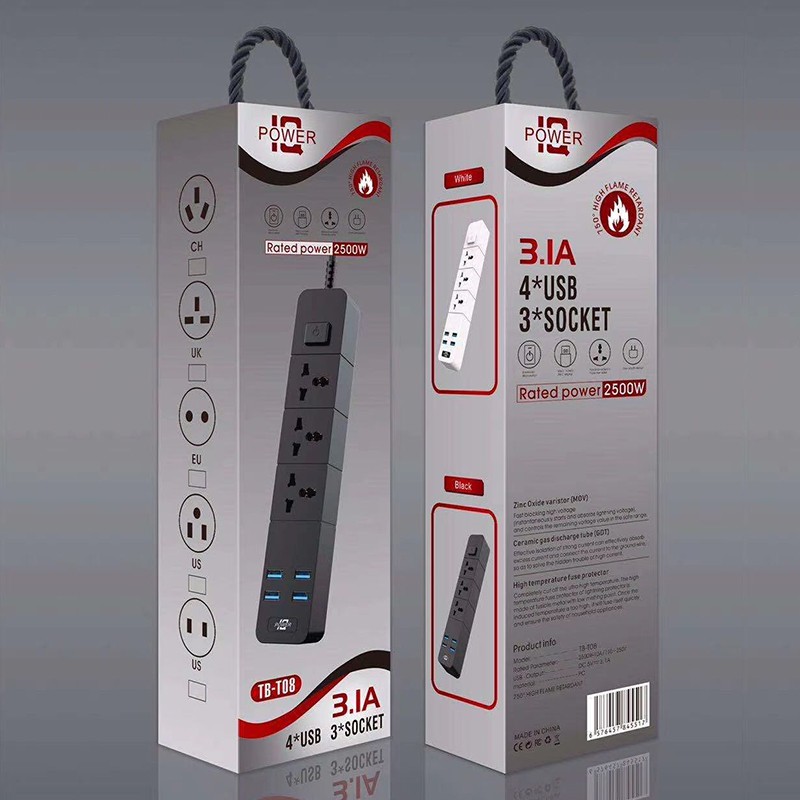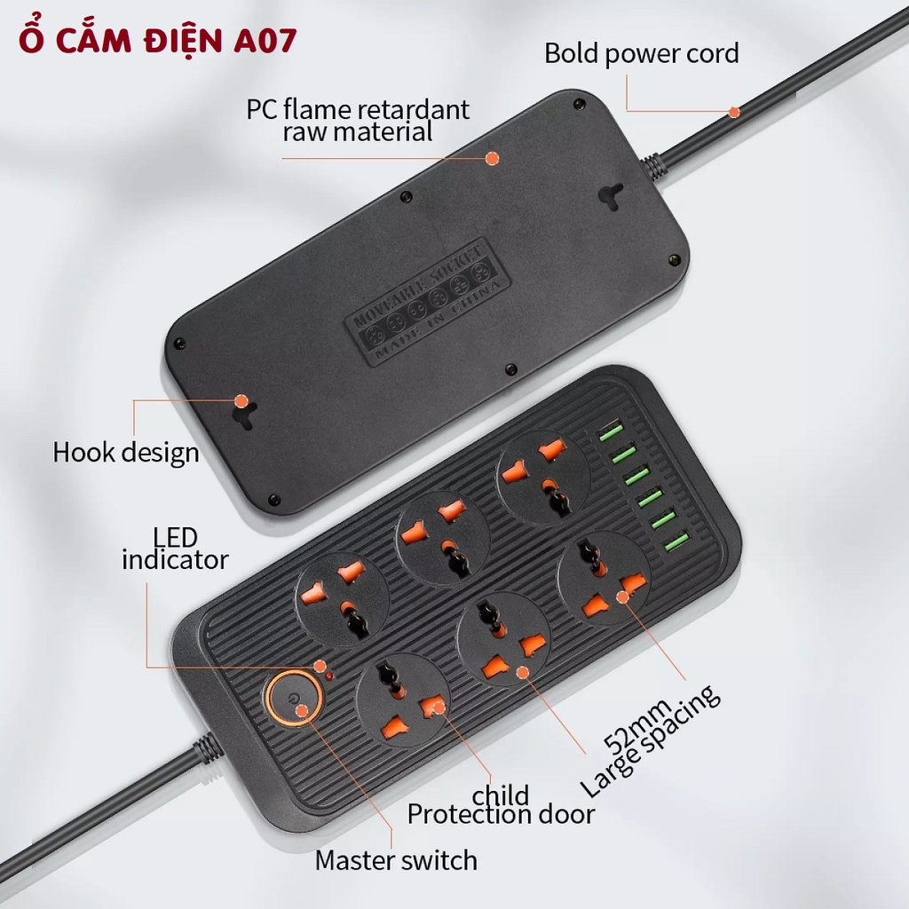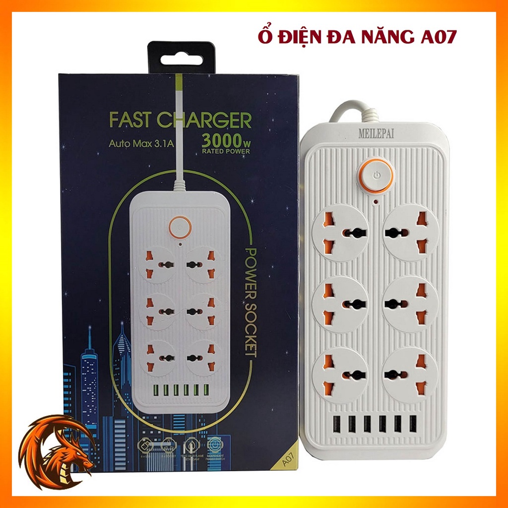 Ổ gồm 3 cổng AC 220V, 6 cổng USB sạc nhanh (max 3.4A), có chip IC thông minh tự ngắt khi quá tải hoặc dòng điện vào lên quá 250V, bảo đảm an toàn cho người sử dụng