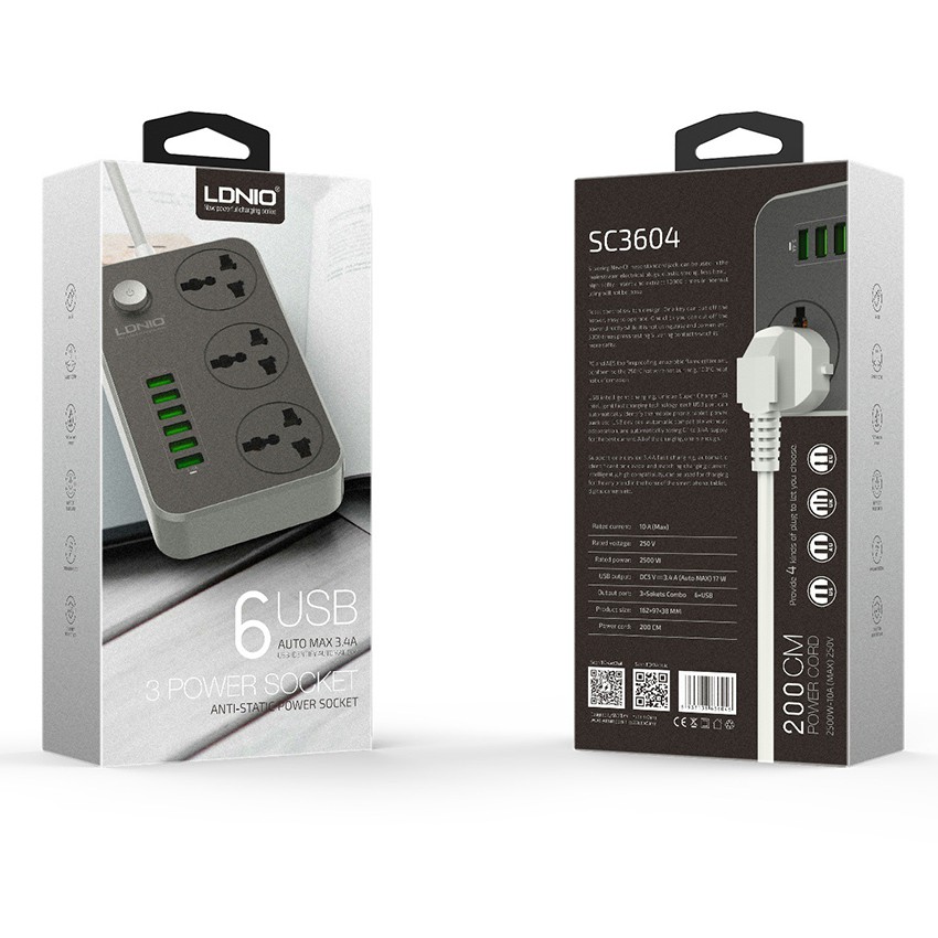 Ổ cắm điện thông minh 6 USB sạc nhanh 3.4A LDNIO (Đen) có kiểu dáng đẹp mắt, thiết kế tính năng thông minh, tiện dụng và an toàn cho mọi gia đình. Sản phẩm có dây dài 2m, phù hợp để sử dụng trong nhà, nối dài ổ điện khi cần.