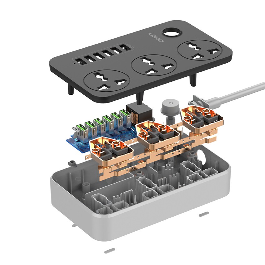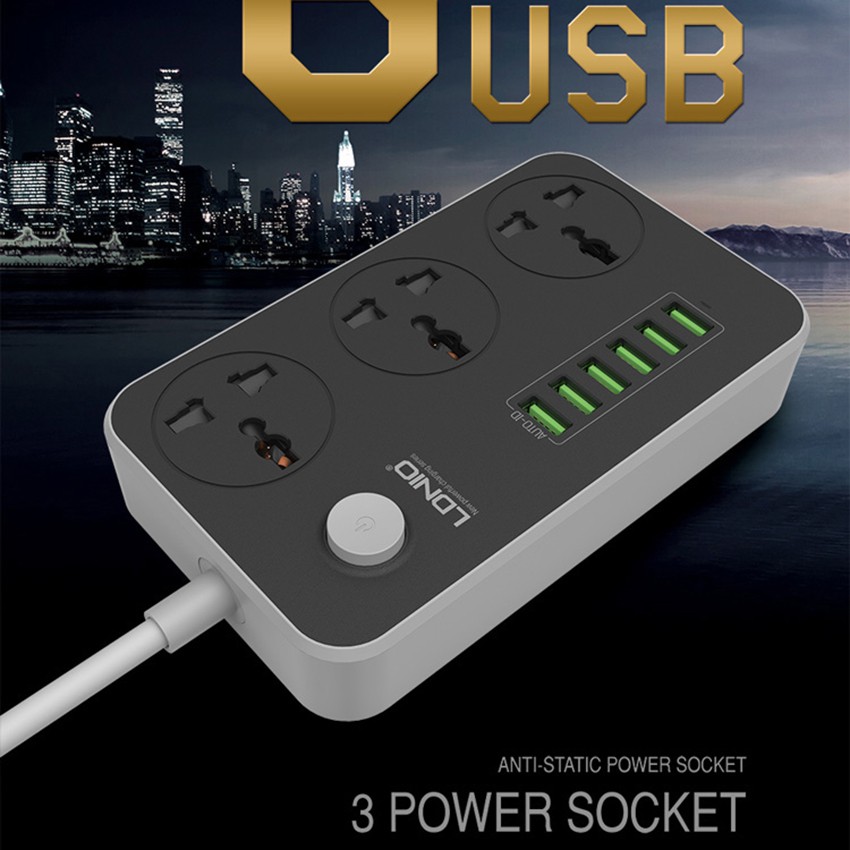 Ổ gồm 3 cổng AC 220V, 6 cổng USB sạc nhanh (max 3.4A), có chip IC thông minh tự ngắt khi quá tải hoặc dòng điện vào lên quá 250V, bảo đảm an toàn cho người sử dụng