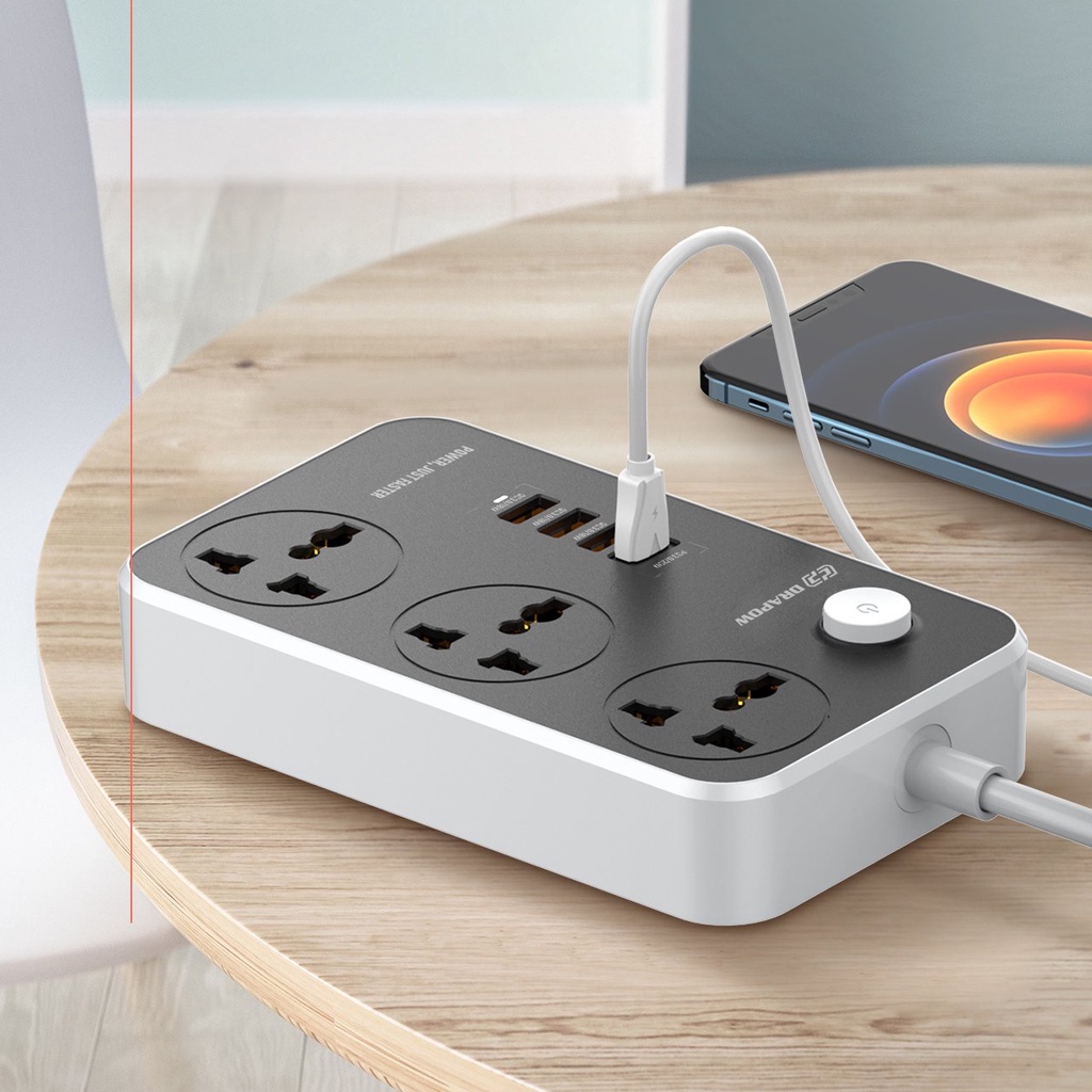 - Ổ cắm điện PD 20W Drapow SK20 trang bị 3 ổ cắm điện, 3 cổng USB và 1 cổng sạc nhanh PD