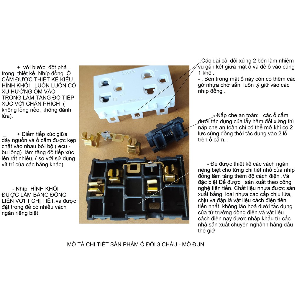 + ĐẶC BIỆT Nhíp HÌNH KHỐI ĐƯỢC LÀM BẰNG ĐỒNG LIỀN VỚI 1 CHỊ TIÊT. ( các hãng khác 2,3 chi tiết mới tạo ra được ) các nhíp hình khối được đặt trong đế có nhiều vách ngăn riêng biệt . Vì vậy có thể nói Nhíp đồng Ổ CẮM ĐA NĂNG LiOA LÀ 1 CẢI TIẾN, PHÁT MINH VƯỢT BẬC , mang lại sự AN TOÀN TUYỆT ĐỐI cho người sủ dụng