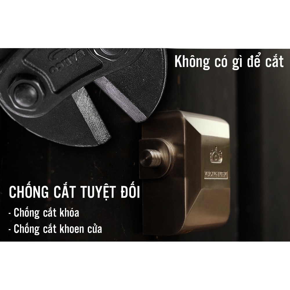 Khi khóa lên cửa, ổ khóa sẽ chụp lấy và bảo vệ khoen cửa. Gọng khóa cũng ẩn bên trong thân khóa. Kẻ trộm không thể dùng kìm công lực để cắt khóa hoặc cắt khoen cửa. Trộm cũng không thể dùng cưa hoặc để cắt.