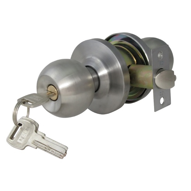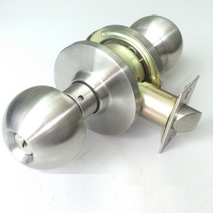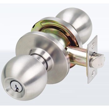 - Đối với khóa cửa tay nắm tròn, rất dễ sử dụng để khóa cửa chúng ta kéo cửa lại chậm và nhẹ, chốt khóa sẽ tự chạy vào lỗ yếm trên khung bao và gài chặt cửa lại chỉ cần bấm nút phía bên trong thì lúc đó tay nắm ngòai sẽ bị khóa cứng. Còn muốn mở khóa chúng ta dùng chìa vặn 45 độ về bên phải hoặc trái, khóa đã được mở, cửa sẽ mở khi chúng ta dùng tay xoay nắm cửa để kéo chốt khóa ra khỏi khung bao.