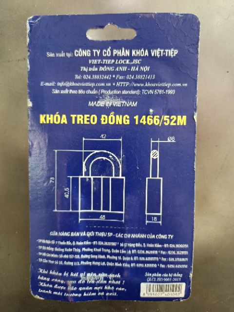 Khóa Việt tiệp là nhãn hiệu khóa nổi tiếng của Việt Nam, đạt danh hiệu Hàng Việt nam chất lượng cao nhiều năm liền.THÔNG TIN SẢN PHẨM: