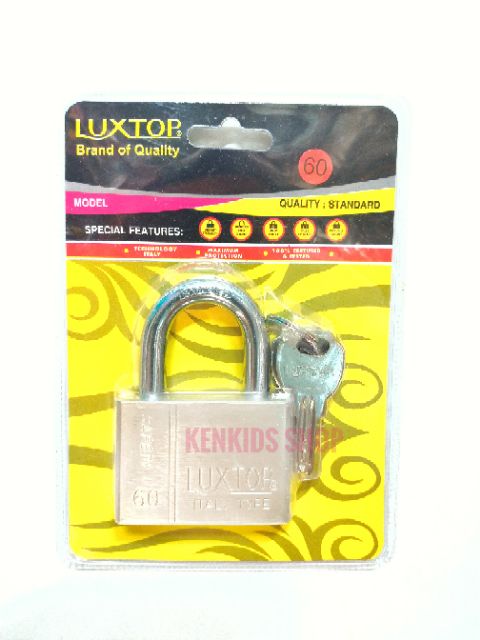 Ổ khóa Luxtop cao cấp. Được sản xuất theo công nghệ của Mỹ, Ổ khóa chống cắt Luxtop làm bằng thép, lõi bằng đồng, thân bằng đồng bên ngoài bọc thép không rỉ. Càng khóa làm bằng thép chịu lực, có khả năng chống lại mọi thao tác cắt, cưa, bảo vệ an toàn cho người thân và tài sản của gia đình bạn. Sử dụng dễ dàng, không cần dùng lực, chỉ cần vài thao tác xoáy nhẹ là bạn đã khóa xong. Với Ổ khóa chống cắt Luxtop cao cấp bạn và gia đình sẽ yên tâm hơn với tình trạng trộm cắp đang hoành hành hiện nay. Kích thước: dài 10cm, rộng 6cm, dày 2cm. Bộ sản phẩm bao gồm 1 ổ và 4 chìa khóa cho bạn sử dụng để khóa cửa nhà ở, xe..Giá DCB