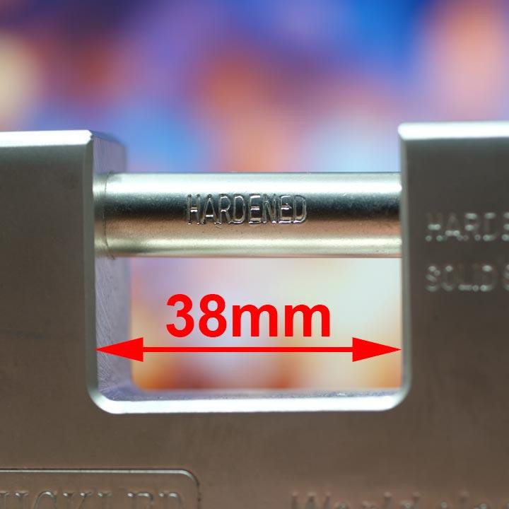 - Gọng khóa bằng thép HARDENED nổi tiếng siêu cứng, có khả năng chống cưa cắt rất tốt. Đặc biệt gọng khóa có đường kính lên đến 14cm kết hơp với thép HARDENED – với Size này kìm công lực thông thường không thể cắt nổi.