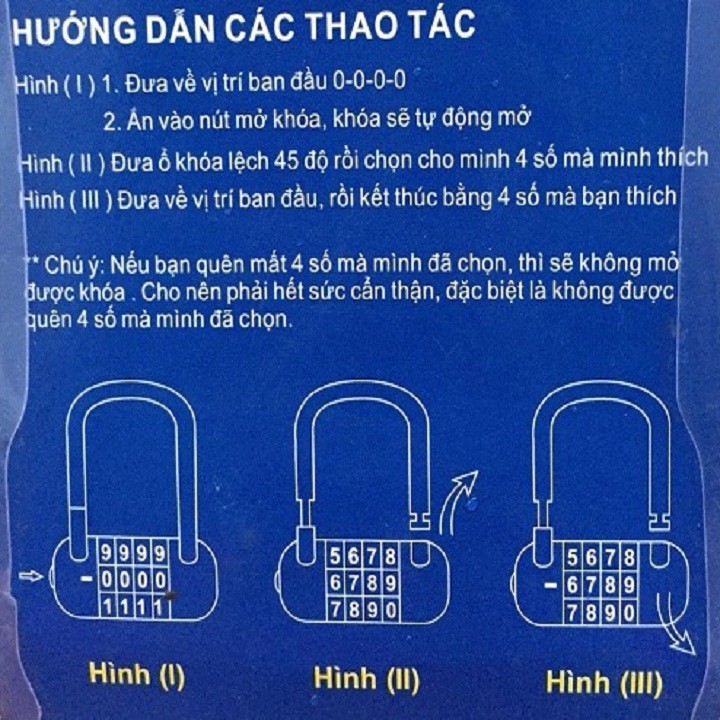 Chú ý: Nếu bạn quên mất 4 mã số mà mình đã chọn, sẽ không mở được khóa nữa, cho nên phải hết sức cẩn thận, đặc biệt là không quên 4 số mà mình đã chọn.