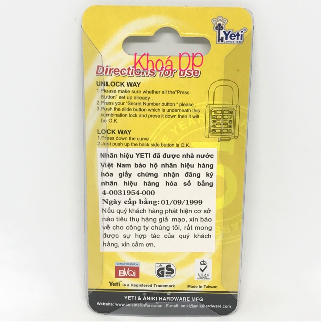 Nhà cửa & Đời sống > Bảo hộ gia đình > Khóa, ổ khóa || Ổ Khoá số YETI 4 phân chính hãng (số cố định)Còn hàng