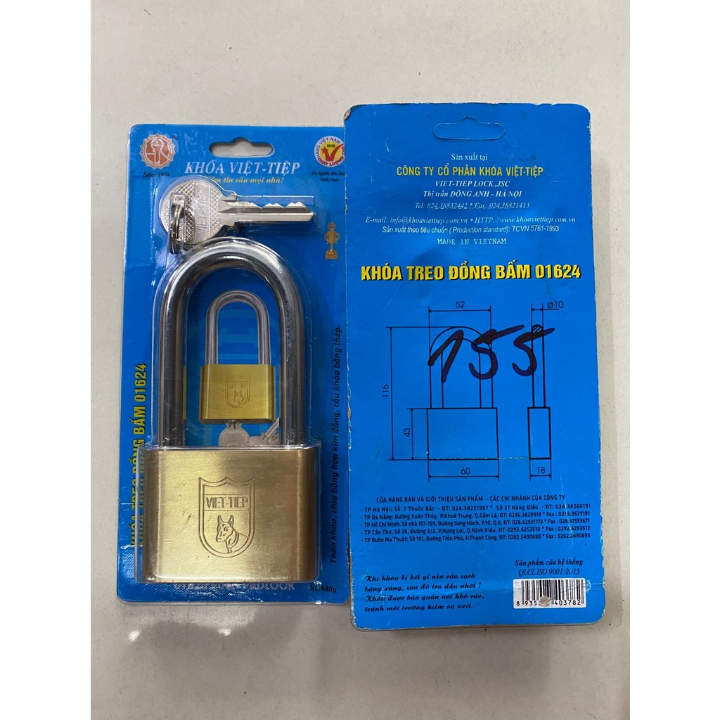 Ổ khoá việt tiệp, khoá càng dài, khoá treo đồng bấm cao cấp, siêu chắc chắn, bền, 60mm loại 01601, 01624Khóa Việt Tiệp là thương hiệu nổi tiếng đạt danh hiệu hàng Việt Nam chất lượng cao. Với nhiều năm kinh nghiệm sản xuất các sản phẩm khóa Việt Tiệp đem lại sự an tâm cho khách hàng bởi độ an toàn cao của các sản phẩm của công ty sản xuất.