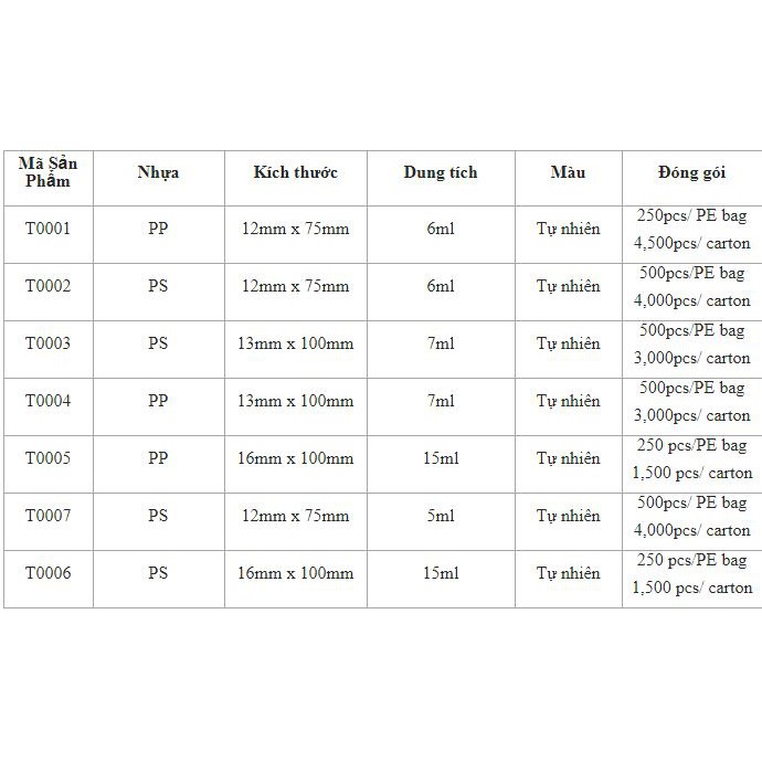 Đặc điểm:- Dung tích 5ml, kích thước (12x75mm), màu trắng