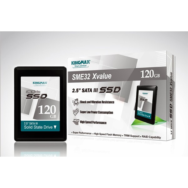 Ổ Cứng SSD KINGMAX 120GB SME35 Xvalue kích thước ổ cứng là 2.5 inch chuẩn Sata 3.1. Tốc độ đọc là 450MB/s. Tốc độ ghi là 150MB/s. Mã hoá AES-256. Cơ chế sửa lỗi cao cấp BCH ECC, Giám sát S.M.A.R.T, Chống rung và sốc