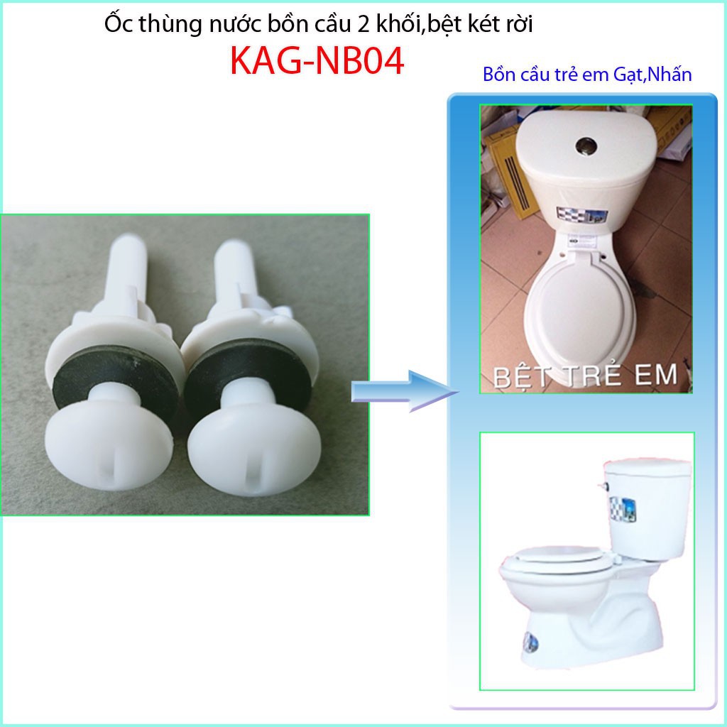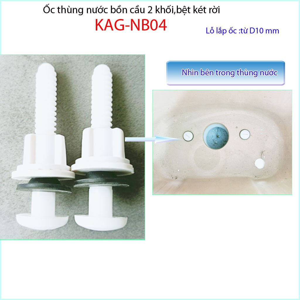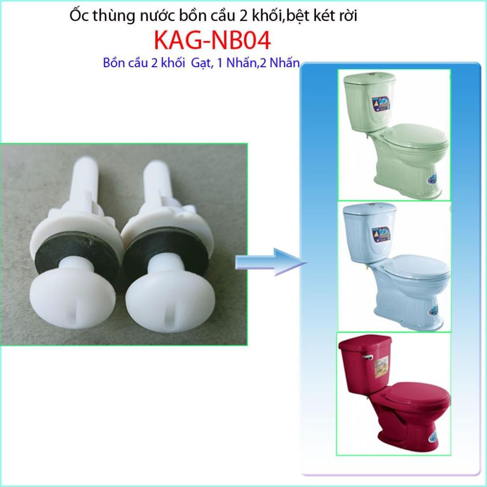 Chất liệu: Ốc thùng nước bồn cầu, ốc két nước bệt 2 khối, ốc bồn cầu KAG-NB04 sản xuất bằng nhựa loại 1, nhựa tốt trắng trong, ốc thùng nước bằng nhựa dùng cho mọi nguồn nước ( nước phèn, nước mặn...) mà không lo bị hoen rỉ.