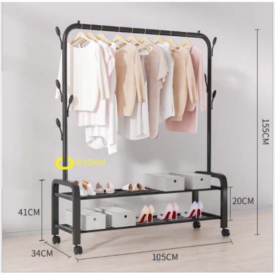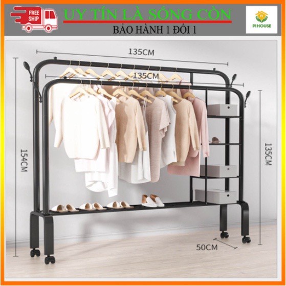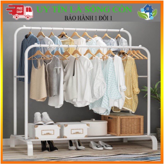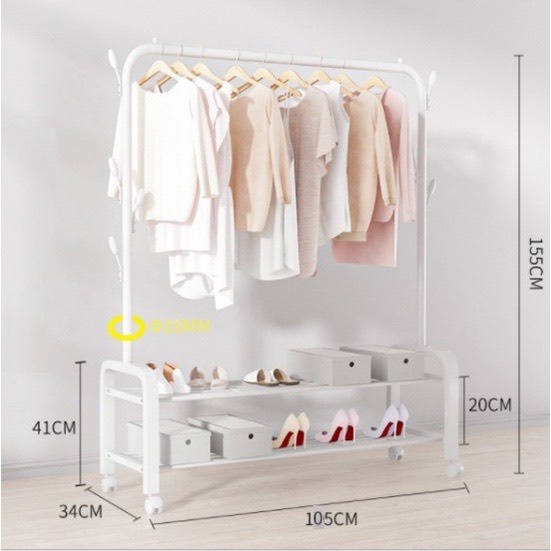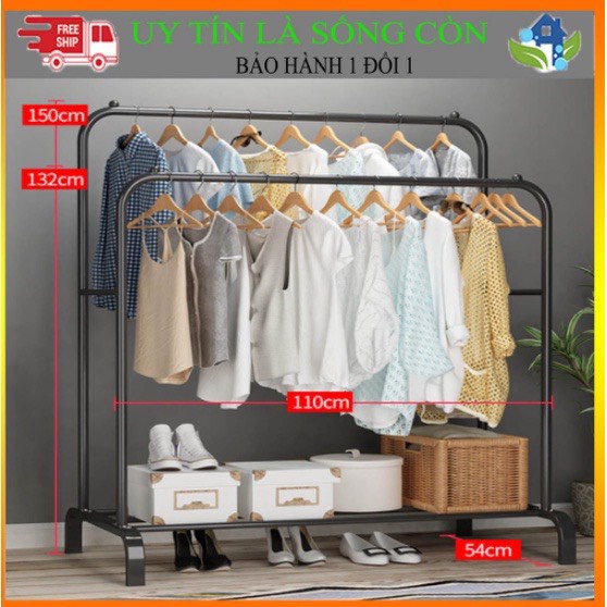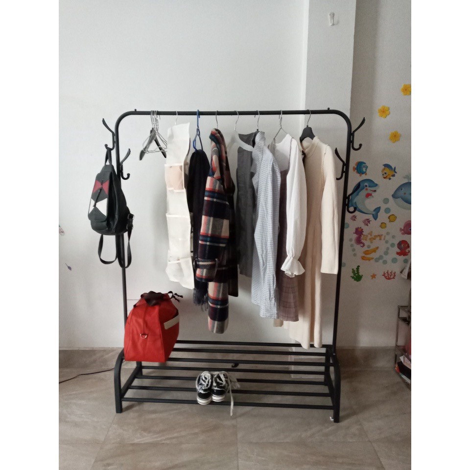 Gía treo quần áo thiết kế thêm 1 tầng có các thanh sắt ngang để đồ, ngoài việc treo quần áo còn có thể để được rất nhiều vật dụng lên tầng dưới của kệ áo như : Giày dép, túi sách, ba lô...