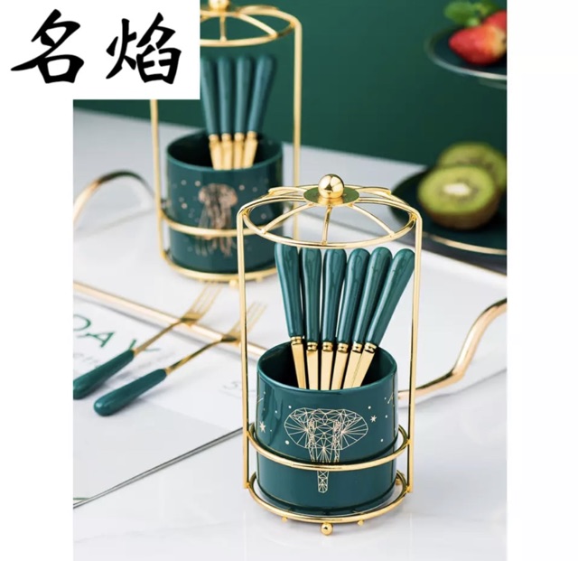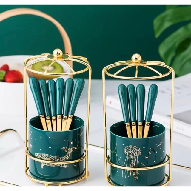 Nhà cửa & Đời sống > Bộ đồ bàn ăn > Bộ dao kéo || Ống cắm thìa dĩa,rỏ cắm thìa màu xanh cổ vịt kèm thìa phong cách châu Âu sang trọngCòn hàng