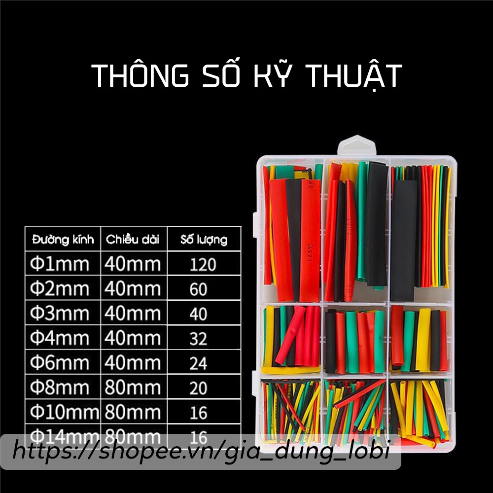 Ống co nhiệt nhiều kích cỡ hộp 328 cái, ống Polyolefin co nhiệt dùng để bọc cách điện cho dây cáp bộ 2:1Chi tiết sản phẩm: