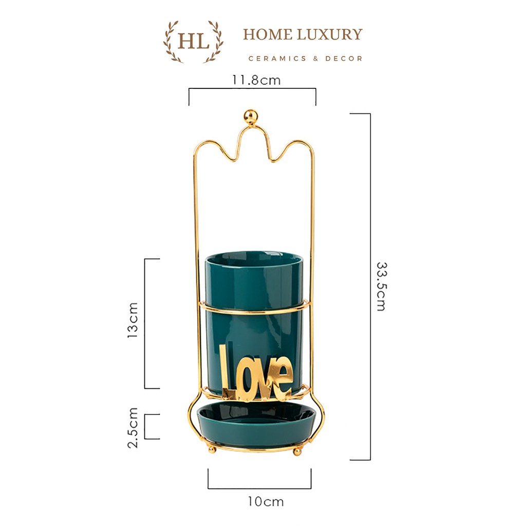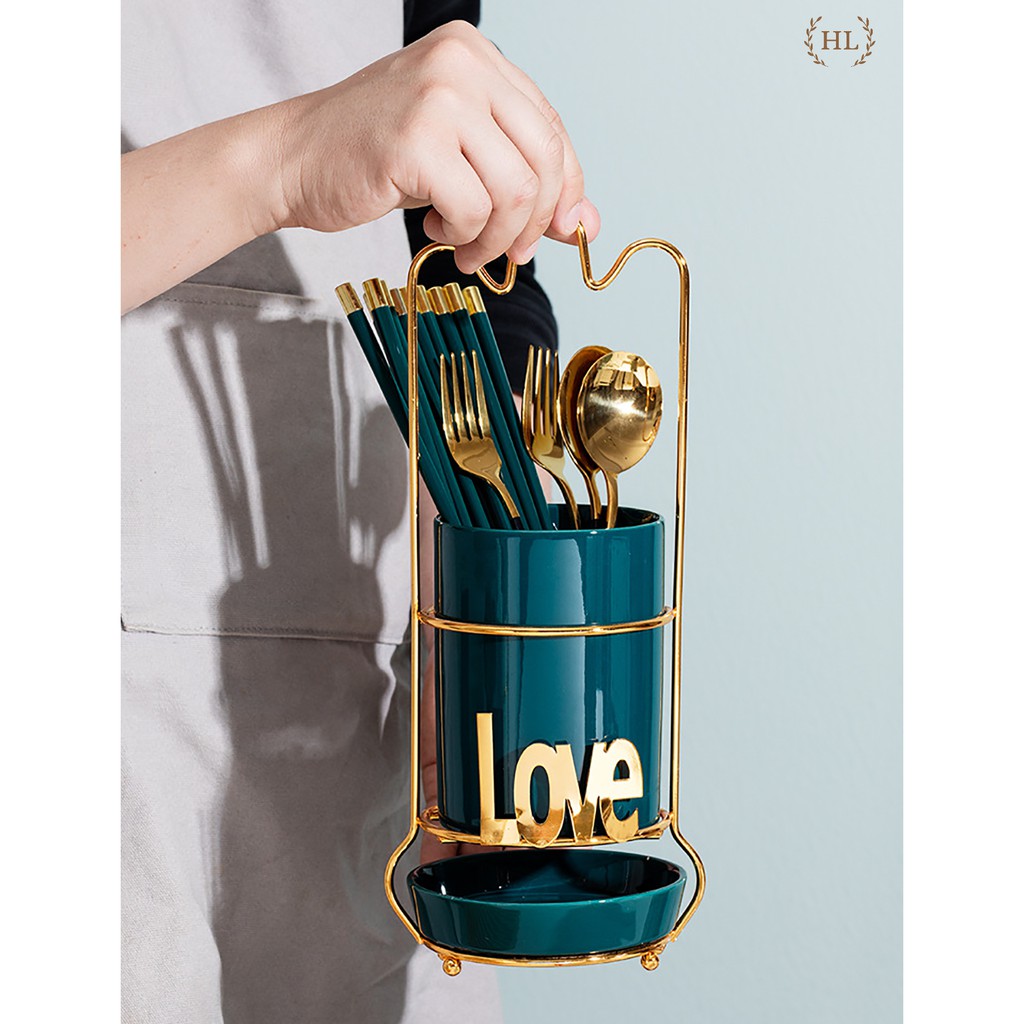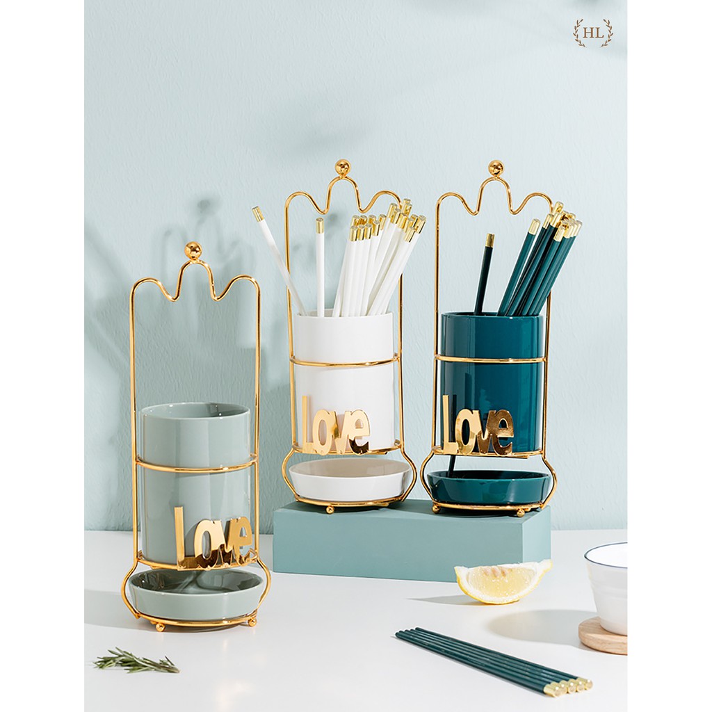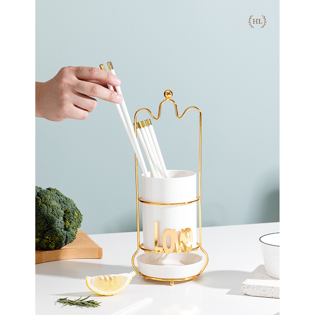 Ống đựng đũa chất liệu sứ khung hợp kim cao cấp | HŨ SỨ CÓ KHAY HỨNG NƯỚC ĐỰNG ĐŨA KHUNG INOX TẠO HÌNH LOVE YOU