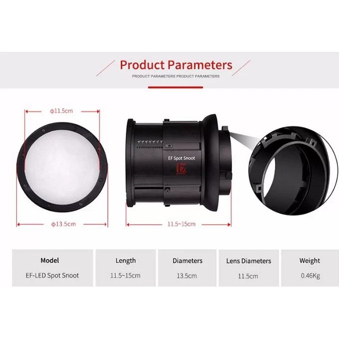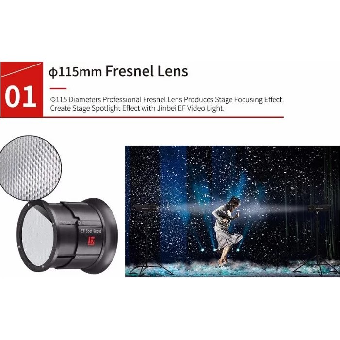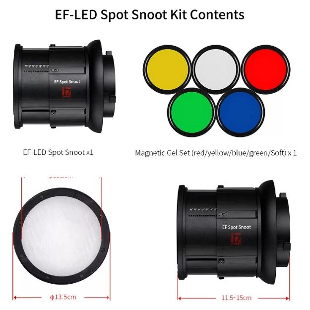 Ống EF Spot Snoot Jinbei là thiết bị hỗ trợ hoàn hảo cho chân dung, đám cưới, quảng cáo, ảnh sản phẩm, v,v… Ngoài ra có các bộ lọc màu đỏ, xanh lam, vàng, xanh lá cây và bộ khuếch tán được cung cấp để khơi dậy sự sáng tạo, sản phẩm ống EF-LED Spot Snoot chính hãng Jinbei được bán tại thietbiquayphim.comTHÔNG SỐ KỸ THUẬT: