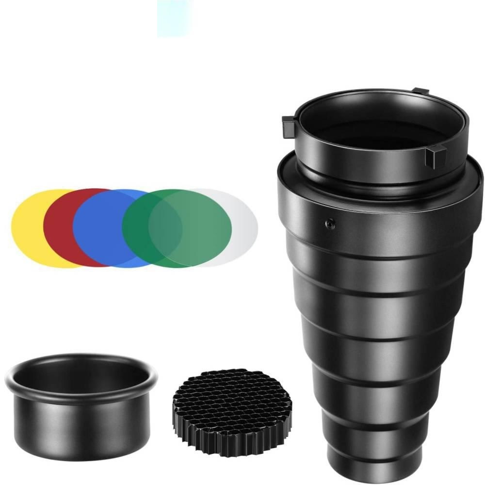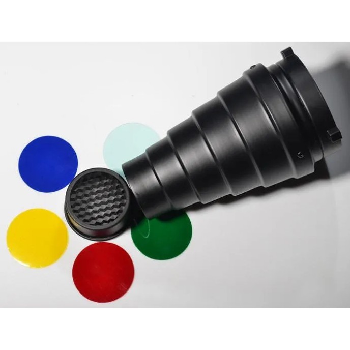 Ống gom sáng Snoot kèm 4 filter màu, lưới tổ ong sử dụng ngoàm bowen thông dụng cho các đèn studio hiện nay. Ống gom sáng giúp gom ánh sáng gom tụ về một hướng cho bức ảnh độc đáo. Ngoài ra kèm với tổ ong hướng ánh sáng về chủ thể tốt hơn và filter tạo màu sắc áng sáng như ý muốn.THÔNG SỐ KỸ THUẬT: