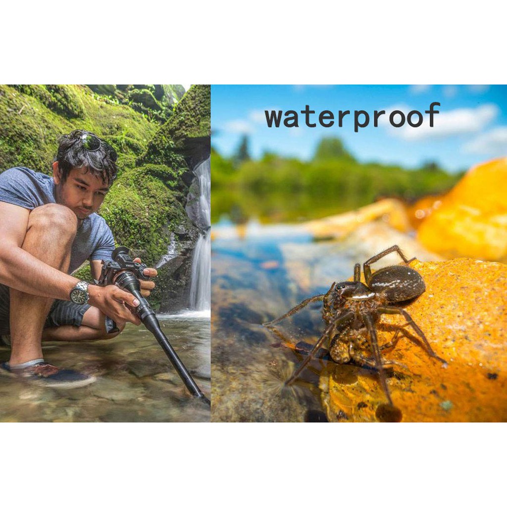 - Phía trước ống kính chống nước cho phép làm việc thoải mái dưới mặt nước hoặc trong môi trường bụi bặm.