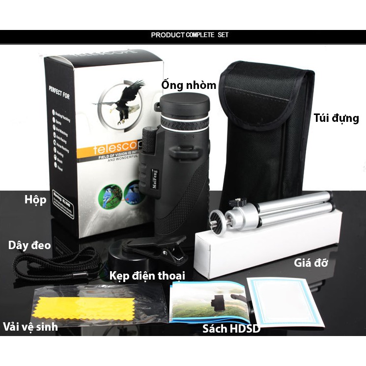 Ống nhòm đơn là ống nhòm chỉ có 1 ống nhòm không bao gồm giá đỡ và kẹp chụp ảnhỐng nhòm full là ống nhòm đầy đủ giá đỡ và kẹp chụp ảnh