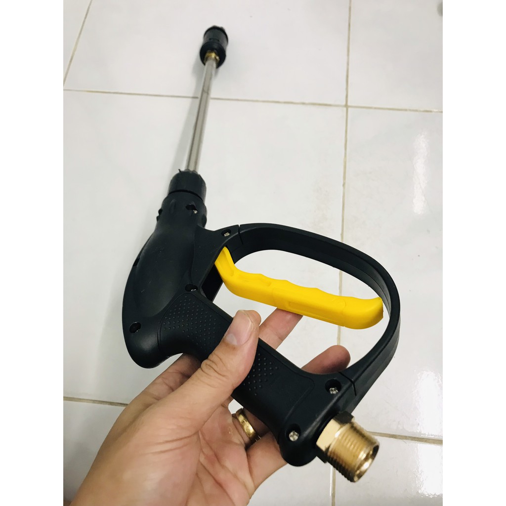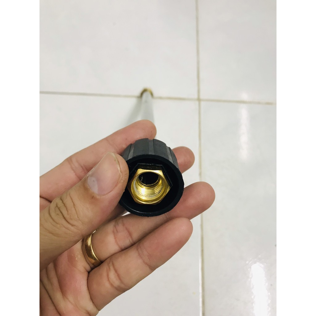 - Ống nối dài có chiều dài lên tới 35cm giúp bạn dễ dàng luôn sâu vào các vị trí khó với tới & tạo 1 khoảng cách nhất định giữa người sử dụng máy bơm xịt rửa xe với vật cần rửa để tránh bắn nước & đảm bảo an toàn hơn.
